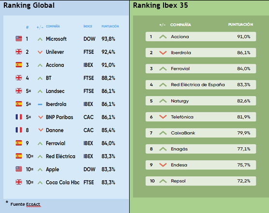 Además, ACCIONA ocupa la tercera posición en el ranking global, que analiza a las compañías de los índices bursátiles más importantes del mundo -DOW30 (EEUU), FTSE100 (Reino Unido), CAC40 (Francia) e IBEX35 (España)-.