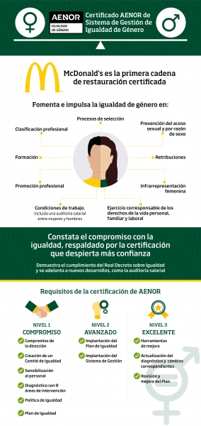 McDonalds ha obtenido el sello SGIG (Sistema de Gestión de la Igualdad de Género) de Aenor, que reconoce su labor de integración e igualdad de trato y oportunidades entre mujeres y hombres en su cultura corporativa. Este reconocimiento ha sido otorgado a la división de Restaurantes McDonald’s para los establecimientos que gestiona directamente, así como para sus oficinas corporativas. La compañía prevé extenderlo a todo el sistema en 2021, un objetivo para el cual trabajará de la mano con sus franquiciadas y franquiciados.