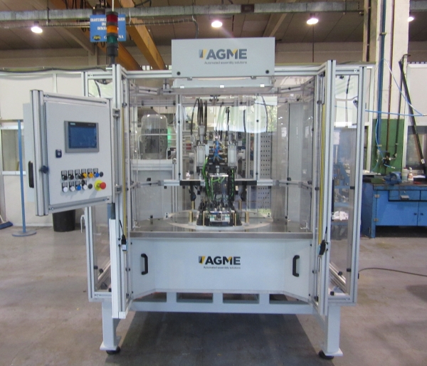 Diseño y fabricación de máquinas especiales para ensamblaje automático de componentes utilizando la tecnología de rebordeado. AGME Automated Assembly Solutions integra prensas hidráulicas de fabricación propia en las soluciones de ensamblaje a medida que diseña y fabrica para los principales fabricantes de componentes de automoción. Maquinas especiales de ensamblaje automático para montaje de casquillos que integran operaciones de deformación como es el rebordeado de componentes