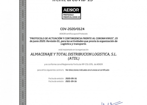 Esta certificación, refrendada por Aenor, avala la eficacia de las medidas específicas aplicadas por ATDL durante la alerta sanitaria para todos sus centros operativos y procesos; un plan integral de contingencia que en el que ha sido necesario evaluar los riesgos específicos de cada sede, teniendo en cuenta factores como la gestión de la salud laboral, buenas prácticas de limpieza, correcto uso de productos químicos, transporte de los empleados, buenas prácticas de higiene del personal, el uso de Equipos de Protección Individual (EPI), así como la formación e información hacia los empleados, o la gestión de los residuos, entre otras acciones.
