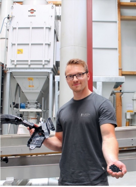En primer lugar, los expertos de Aurora examinan su materia prima mediante el análisis espectral en laboratorio, para determinar con precisión su composición. Luego, muelen las piezas de plástico en pedazos pequeños. Parte del material molido se vuelve a vender directamente, pero la mayor parte se transforma en un compuesto de gran calidad tras la incorporación de aditivos fundidos en un nuevo proceso de extrusión, a partir del cual se pueden fabricar nuevos materiales.