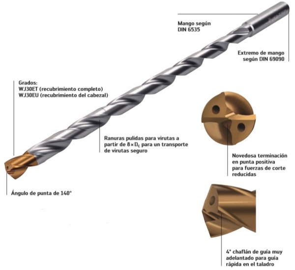 - Grados: WJ30ET, K30F TiSiAlCrN/AlTiN (recubrimiento completo); WJ30EU, K30F TiSiAlCrN/AlTiN (recubrimiento del cabezal).