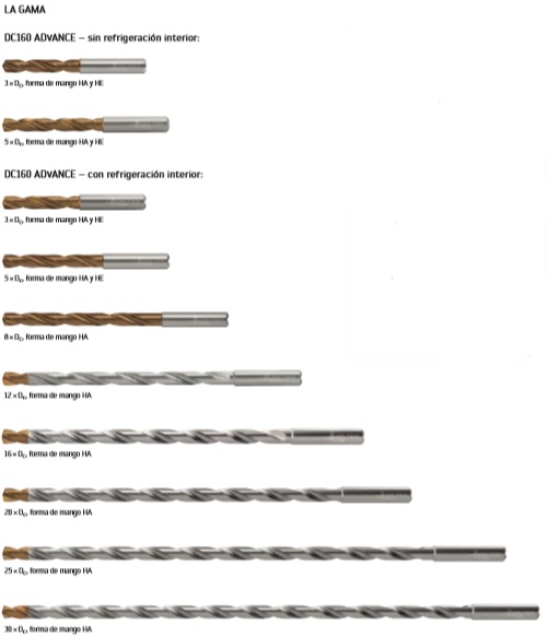 - Dimensiones desde ~ 3 x Dc (según DIN 6537 corta) hasta 30 x Dc según norma Walter.
