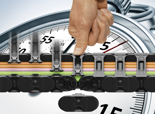 Inspirada en la naturaleza, diseñada para la industria: así es la nueva cadena portacables E4Q de igus. Los eslabones cuentan con un diseño liso y contorneado, y los travesaños están diseñados a partir de un nuevo concepto con pestañas de fijación para reducir el peso. Este diseño de travesaño garantiza que la nueva serie se pueda abrir y cerrar en cuestión de segundos sin necesidad de herramientas. La cadena portacables se ha desarrollado especialmente para que cumpla los requisitos especiales de las carreras autosoportadas largas.