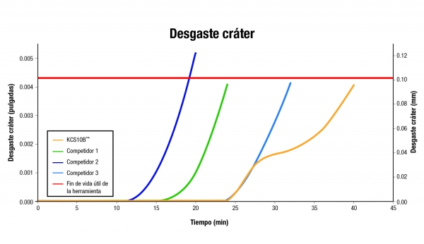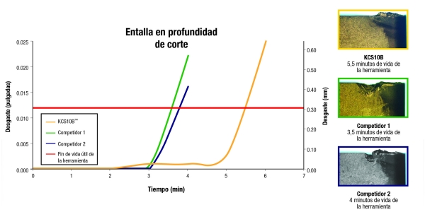 La KCS10B tiene un recubrimiento revolucionario sobre un sustrato de carburo de grano ultra-fino para conseguir una adhesión superior de capa y ofrece hasta un 50% más de vida útil de la herramienta, con procesos más predecibles y productividad mejorada cuando se trabajan aleaciones difíciles de mecanizar. La KCS10B supera los desafíos más comunes que se plantean cuando se mecanizan superaleaciones, como por ejemplo la formación de cráteres y la entalla en profundidad de corte, dos modos de desgaste que llevan generalmente a una avería inesperada e incluso catastrófica de la herramienta.