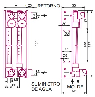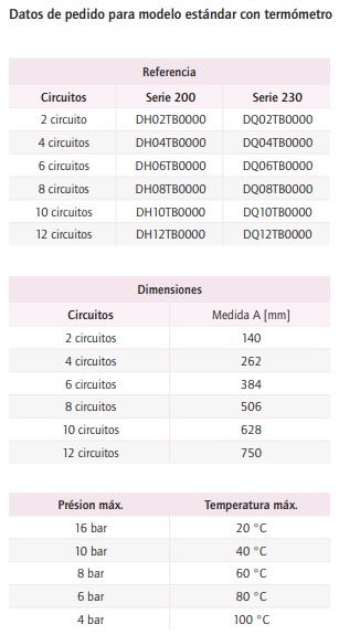 - Estándar: Conexiones de molde con manguito roscado G 3/8’’ de latón. Bajo solicitud: con conector roscado de latón de 14 mm para mangueras de 1/2’’, o conector de 20 mm para mangueras de 3/4’’.