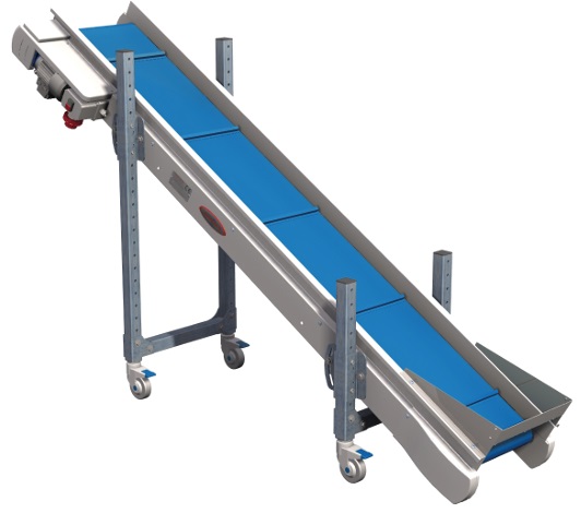 Su ángulo de inclinación es regulable de 0 a 35º y permite la posibilidad de extraer la tolva de recepción de una manera sencilla para poder utilizar esta cinta como una cinta plana horizontal. Lleva incorporados faldones laterales para evitar la caída del producto durante su recorrido sobre la banda.