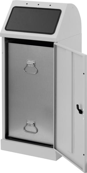 - Recipiente colector de 75 l con recipiente interior galvanizado (estanco a los líquidos en la zona del suelo) y puerta batiente (con sujeción magnética y cerradura cuadrangular).