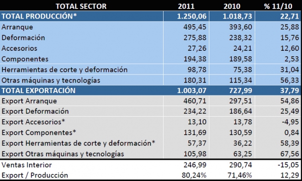 De cualquier modo, el conjunto del sector de las tecnologías de fabricación creció en facturación un 22,7% con una cifra global de 1.250,1 millones de euros. Las máquinas-herramienta supusieron 771,3 millones de euros, un 22,1% más con respecto al año anterior. Los componentes, accesorios y herramientas, 320,4 millones de euros, un 10,8% más, y las otras máquinas y tecnologías, 180,3 millones de euros, un 56,3% más que en 2010. Las exportaciones supusieron más de un 80% de las cifras globales del sector, que en el caso de las máquinas-herramienta alcanzaron un llamativo 90,1% de la cifra de facturación.