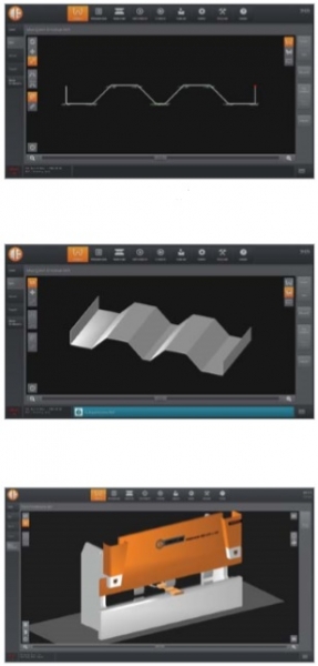 - Puede mostrar la imagen en 3D de la pieza en la máquina y, al mismo tiempo, calcular la secuencia de plegado.