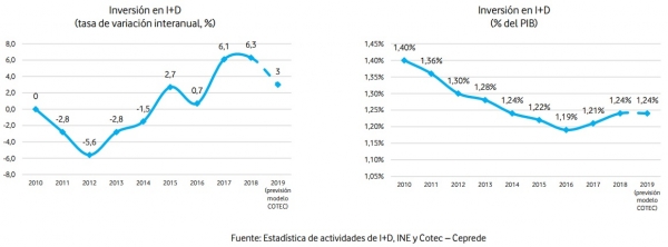 Esta desaceleración en el crecimiento de la inversión, combinada con el estancamiento del PIB nominal (que se mantuvo en el 3,6% en 2019), apuntaría, según los cálculos de Cotec, a un estancamiento del peso de la I+D en la estructura productiva en el 1,24% del PIB, el mismo valor registrado en 2018.