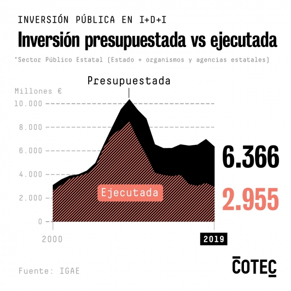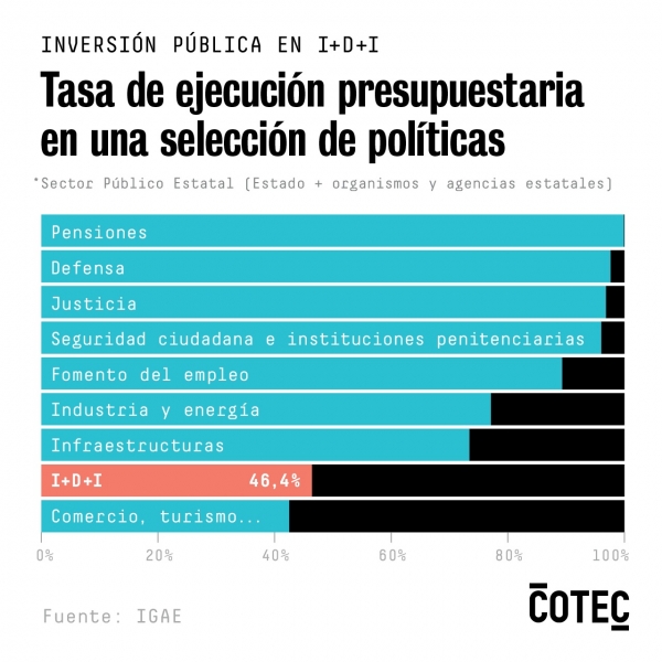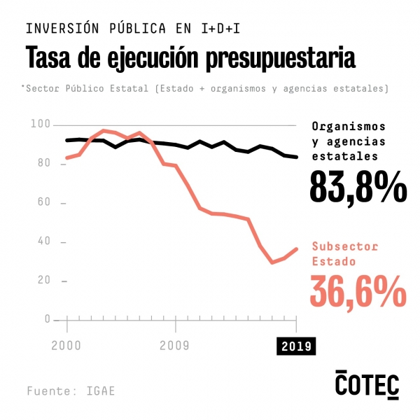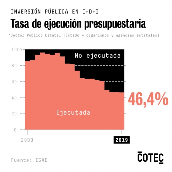 En términos efectivos, la inversión para el conjunto de la Política 46 (I+D+i) en 2019 se redujo en 323 millones de euros respecto al año previo. La tasa de ejecución presupuestaria de 2019 fue la más baja desde que se empezó a registrar el dato, en 2000, situándose muy cerca de la observada en 2017 (46,6%).