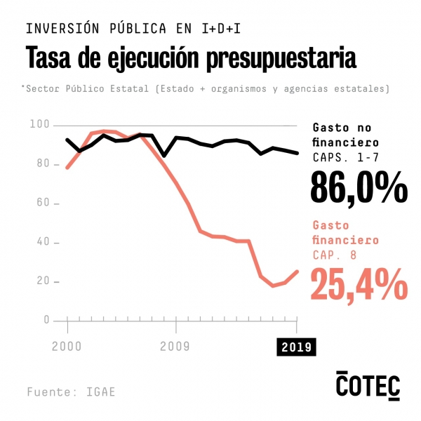 La progresiva apuesta en los últimos años hacia el capítulo 8 en detrimento del gasto no financiero (capítulos 1 a 7) ha evolucionado en paralelo a un decreciente grado de ejecución de la política de I+D+i. El gasto financiero concentró en 2019 cerca del 65% del total del presupuesto para I+D+i y su tasa de ejecución fue del 25,4%. En 2008, por ejemplo, el capítulo 8 representaba la mitad del presupuesto y su tasa de ejecución rondaba el 80%.