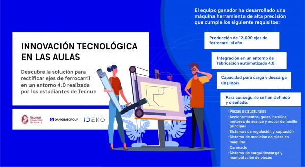 Con el propósito de acercar la realidad de los entornos reales de fabricación a la comunidad educativa, Danobatgroup ha vuelto a premiar este año un proyecto de innovación aplicada a los procesos de fabricación industrial, elaborado por los estudiantes del Máster de Ingeniería Industrial de la Escuela Superior de Ingenieros de la Universidad de Navarra Tecnun.