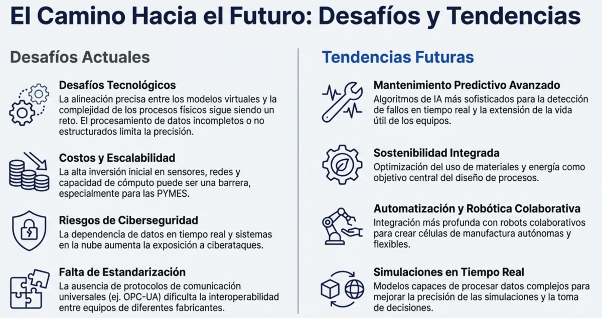 Vamos a realizar un análisis exhaustivo de los desafíos tecnológicos, de infraestructura y operativos que actualmente limitan la implantación generalizada de los Gemelos Digitales en el sector del mecanizado. Asimismo, se explorarán las tendencias futuras que están configurando la próxima generación de fabricación inteligente, identificando las áreas clave que definirán la evolución de esta tecnología transformadora.