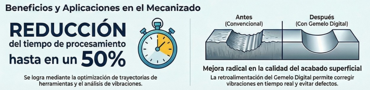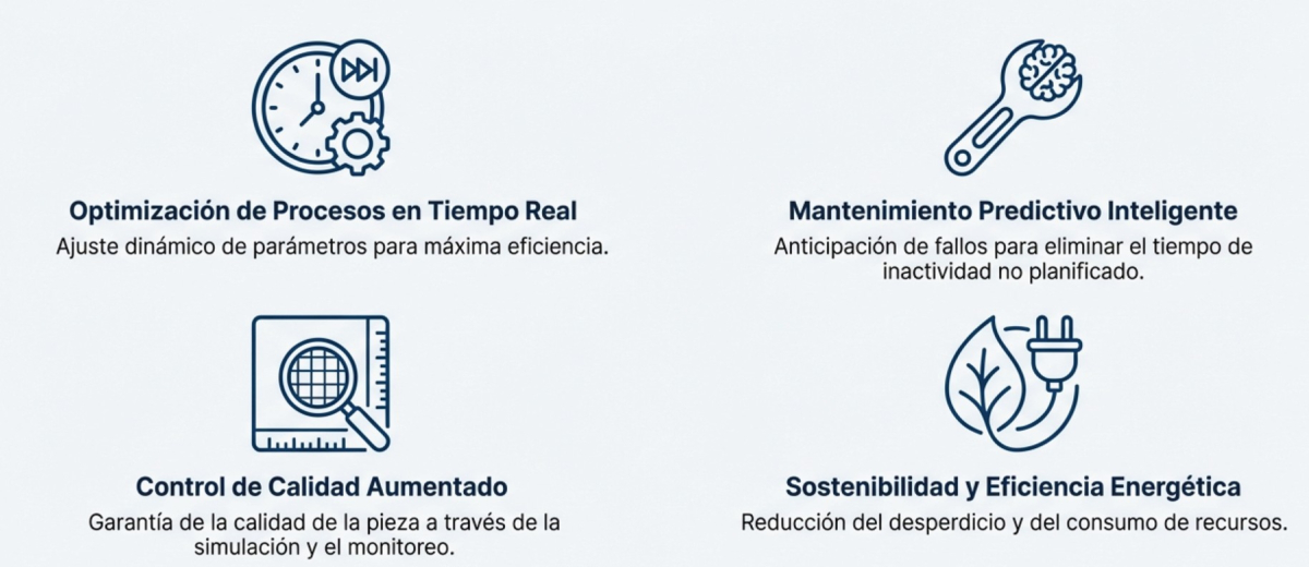 El Big Data es el núcleo que permite a la fabricación pasar de un paradigma reactivo a uno predictivo. Su capacidad para procesar y analizar los inmensos volúmenes de datos generados en el mecanizado permite identificar patrones, optimizar operaciones y tomar decisiones informadas en tiempo real. Los beneficios estratégicos derivados del análisis de BD incluyen una significativa reducción de costes, ahorro de tiempo y la optimización de procesos de producción. Un ejemplo destacado de su impacto es la aplicación de un modelo de Gemelo Digital basado en el análisis de Big Data para optimizar la trayectoria de la herramienta que logró una reducción del tiempo de procesamiento de hasta un 50%.