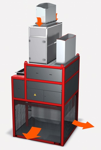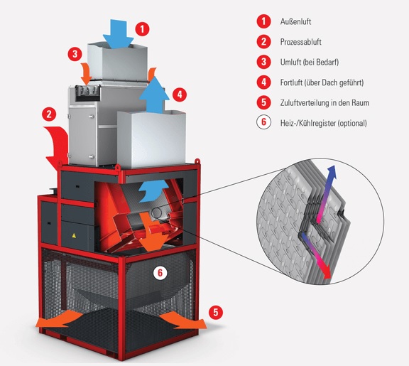 El aire de escape del proceso y el aire exterior frío se dirigen uno al otro en el intercambiador de calor de flujo cruzado. Debido a sus dos corrientes de aire separadas que utilizan canales separados, el suministro de aire fresco no está contaminado. El aire de escape se libera a través del techo. El calor se transfiere de manera eficiente.
