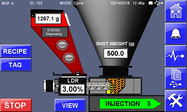 Durante el ciclo de moldeo por inyección, aproximadamente el 75% de la resina virgen ingresa al tornillo durante la fase de recuperación y el 25% durante la inyección. Debido a que los dosificadores convencionales alimentan color solamente durante la recuperación, el mezclado puede ser insuficiente. Esto es particularmente problemático cuando el gramaje de inyección se aproxima a la capacidad total del tornillo o cuando el producto final es translúcido. En el nuevo sistema 100% Injection Coloring™, un controlador especial en el dosificador MGF recibe señales de la máquina de transformación en ambas fases, lo que garantiza que se añada color durante todo el ciclo.