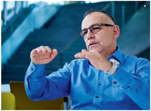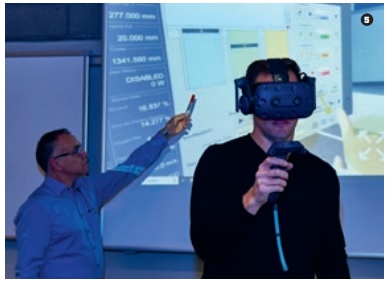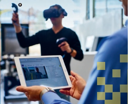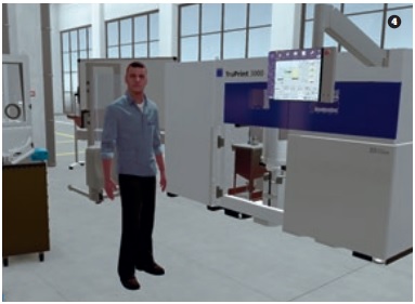 Francesco de Marco crea formatos de aprendizaje junto con compañeros y empleados. En una aula oscurecida, su compañero Christopher Poppel repara y hace el mantenimiento de una máquina con ayuda de un equipo de realidad virtual. Sostiene en las manos dos controladores y lleva puestas unas grandes gafas de RV. Está reparando la impresora 3D TruPrint 3000 proyectada en una pantalla en la pared.