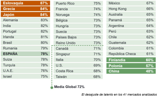 En el contexto global, la escasez de talento también se confirma como un fenómeno generalizado, con países como Eslovaquia (87%), Grecia y Japón (84%) o Alemania (83%) a la cabeza. Con los datos actuales, España se consolida como uno de los mercados con mayor presión en la búsqueda de profesionales cualificados, muy por encima de economías como EEUU (69%) o Italia (70%) y en línea con otros grandes mercados europeos.