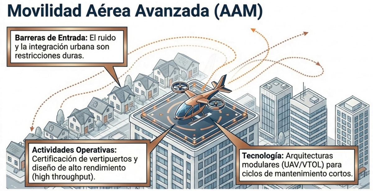 La Movilidad Aérea Avanzada (AAM) se define como un ecosistema emergente que busca habilitar servicios de transporte aéreo, particularmente mediante vehículos de despegue y aterrizaje vertical eléctricos (eVTOL), en entornos urbanos y regionales. Su implementación exitosa no depende únicamente de la aeronave, sino de una integración urbana compleja que aborda desafíos técnicos, infraestructurales y sociales.