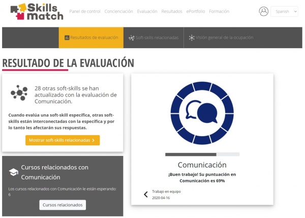 La plataforma SkillsMatch, que está disponible en castellano e inglés y se puede utilizar en todos los países de la Unión Europea por parte de usuarios individuales, empresas e instituciones que fomentan el empleo, ofrece una herramienta de autoevaluación de soft skills que muestra puntos fuertes y débiles en relación con el perfil que se pide en sus ocupaciones específicas.