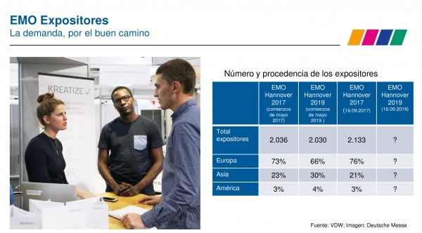 Por ello, EMO Hannover es la única plataforma realmente internacional dedicada a la fabricación con metales. Contrariamente a lo que ocurre en las demás ferias que se califican de internacionales, limitándose esta característica al origen de los expositores, a la EMO Hannover acuden también los visitantes profesionales procedentes del mundo entero. En 2017 casi la mitad de los alrededor de 130.000 participantes en la feria que vinieron a Hannover desde fuera de Alemania procedían de unos 160 países. En el caso de los expositores, el porcentaje fue en aquella ocasión de un 64%”.