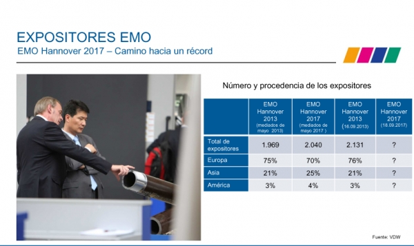 Como feria de referencia mundial, la EMO Hannover se caracteriza por su tamaño, nivel de internacionalidad y el número de innovaciones que presenta. A finales de abril de 2017 se habían inscrito ya para participar en la feria más de 2.000 empresas, procedentes de 44 países, con más de 175.000 m² de superficie neta de exposición. Ya sólo de Europa son más de 1.400 expositores. “Con ello el nivel de inscripciones recibidas hasta ahora se sitúa claramente por encima del alcanzado en el momento correspondiente en la edición anterior“, informó Wilfried Schäfer. Todo hace prever que en la EMO Hannover 2017 se alcanzará un nuevo récord.