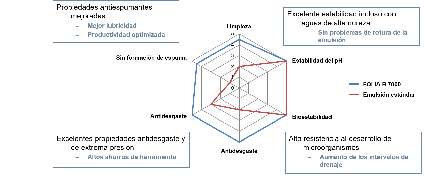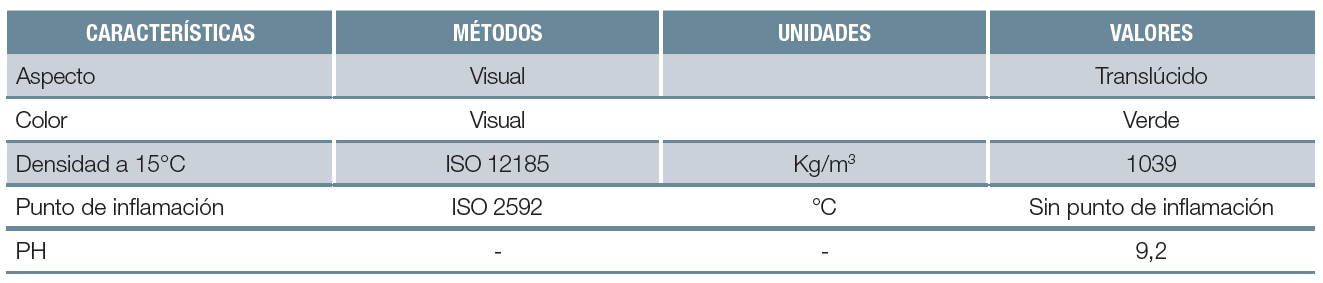 Es un fluido sin olor que se basa en una tecnología libre completamente de formaldehído y boro. Es un producto que no produce dermatitis, libre de pictogramas. Además, no contiene aceites minerales ni emulsionantes. Es un fluido de base acuosa y fácilmente biodegradable según OCDE 301B. Tiene una alta bio-estabilidad según DBL 6570, por lo que se consigue aumentar los intervalos de cambio significativamente.