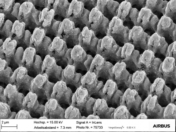 Usando la tecnología DLIP, un equipo de investigación de Fraunhofer IWS colaboró estrechamente con los socios del proyecto -Airbus y la Universidad Tecnológica de Dresde- para desarrollar un proceso que permita la creación de estructuras complejas y serpenteantes en la escala de micrones y submicrones, para reducir la acumulación de hielo y acelerar el deshielo. Lo que distingue a este proceso es que los investigadores combinaron DLIP con láseres de pulso ultracorto para crear microestructuras 3D multinivel en perfiles de ala en un solo paso.