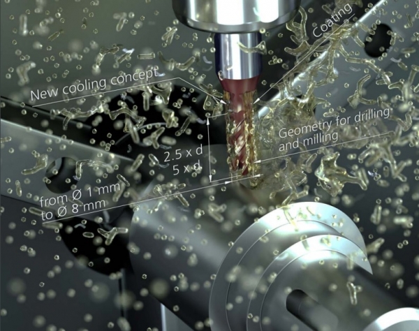 CrazyMill Cool P&S es una nueva fresa de 3 canales de Mikron Tool, especialmente desarrollada para el fresado de desbaste y el acabado de muchos materiales, con énfasis en aceros inoxidables, titanio, súper-aleaciones y aleaciones de CrCo. Con capacidad de sumergirse perpendicularmente en el material, esta herramienta está bien adaptada para fresar ranuras, cajeras y caras en espacios mínimos. Un ejemplo de esta aplicación es el chavetero que puede encontrarse en los ejes de transmisión.