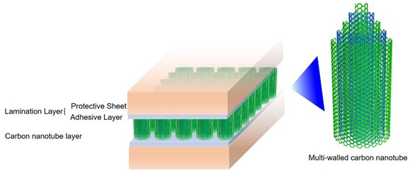 Los nanotubos de carbono tienen una alta conductividad térmica y representan una opción prometedora para la disipación de temperatura de las fuentes de calor, incluyendo los dispositivos semiconductores. Sin embargo, el material sigue siendo difícil de manejar debido a su fragilidad, haciéndolo poco práctico para muchos propósitos. Para hacer frente a esta situación, la multinacional ha desarrollado, con éxito, una tecnología para laminar nanotubos de carbono alineados verticalmente, manteniendo al mismo tiempo sus características originales de alta conductividad térmica y flexibilidad, así como una tecnología para unirlos con suficiente adhesión. Esto facilita el corte y la manipulación de las láminas de nanotubos de carbono, lo que permite utilizarlas como material de disipación de calor, por ejemplo, en módulos de energía automotriz para vehículos eléctricos (EV).