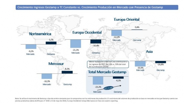 La cifra de facturación reportada implica un descenso de -7,3% (o un -6.1% a tipo de cambio constante) en un mercado que decreció un -23,2% durante el mismo periodo. El primer trimestre de 2020 se ha visto impactado por el desafío sin precedentes de la pandemia del COVID-19. Con todo ello, Gestamp ha sido capaz de superar al mercado como resultado de nuevos proyectos y una menor exposición a Asia.