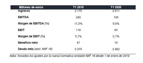 El EBITDA alcanzó los 193 millones de euros (un descenso del -22,6% comparado con los tres primeros meses de 2019), alcanzando un margen del 9,6%. La compañía está centrada en mejorar su flexibilidad de costes para afrontar la actual situación.