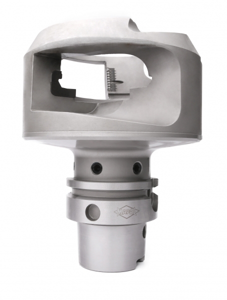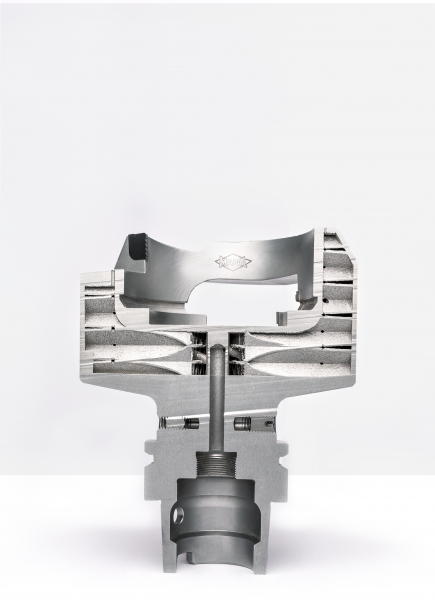 De esta manera, Mapal ha optimizado la herramienta de campana existente, fabricada de manera convencional. Utilizando el proceso de fusión selectiva por láser, se ha modificado el interior de la herramienta; en lugar de material sólido, ahora hay una estructura de panal especialmente diseñada. Como consecuencia, la herramienta es un 30% más ligera y la vida útil de la herramienta aumenta en aproximadamente un 40% debido al efecto de amortiguación.