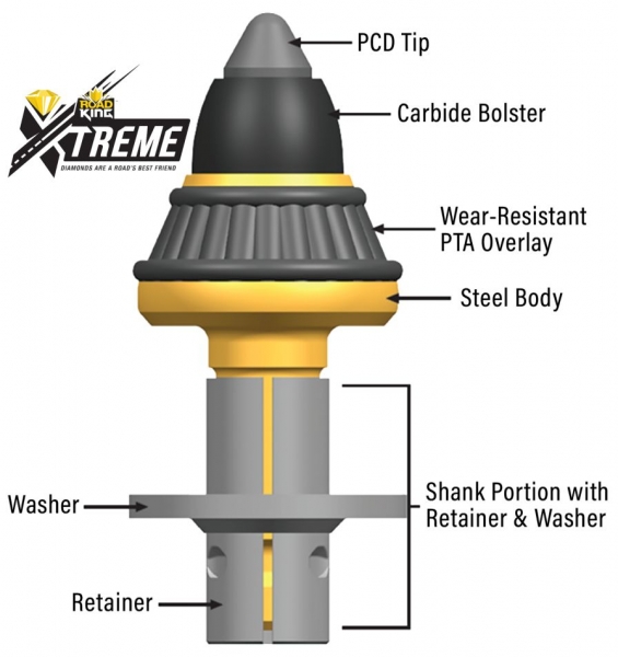Road King™ Xtreme de Kennametal ofrece nuevos niveles de rendimiento y productividad en el fresado de carreteras. La fuerza combinada de una punta de PCD con la flexibilidad de una herramienta de metal duro (base giratoria) ofrece un gran rendimiento.