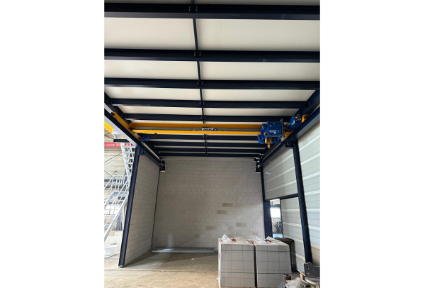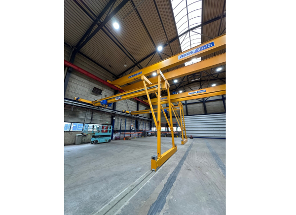 - Tres grúas semipórtico monorraíles con una capacidad de elevación de 5 t cada una. Estas grúas son ideales para mover de forma eficiente piezas dentro de áreas de trabajo específicas en la nave, ofreciendo un flujo de trabajo flexible sin comprometer el rendimiento de elevación.