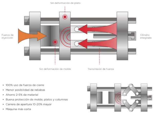 Gracias a sus guías lineales, el posicionamiento del molde ofrece una precisión de 0,01 mm, misma precisión que se obtiene en el posicionamiento del grupo de inyección, que también incorpora guías.