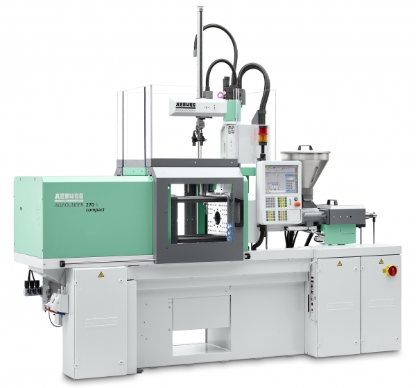 La Allrounder 270 S compact con una fuerza de cierre de 350 kN y una unidad de inyección de tamaño 100 ahora también está disponible con una unidad de línea de partición. Al reposicionar la unidad de inyección, también se puede utilizar para inyectar verticalmente en la línea de partición del molde, lo que posibilita una variedad más amplia de moldes y procesos.