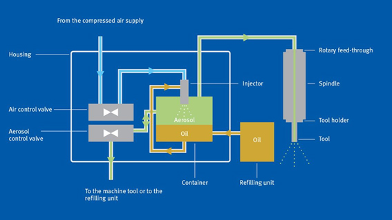 AerosolMaster®system con tecnología ATS es un sistema que se basa en la tecnología ATS (aerosol de lubricación seca). Si es necesario, el sistema puede complementarse con tecnología de refrigeración criogénica.