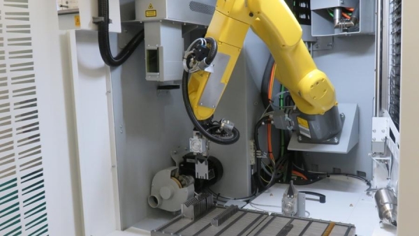 Mientras se afila una cuchilla en máquina, la siguiente pieza se recoge del almacén y se marca con láser, una vez la cuchilla se ha completado, se limpia en la estación de soplado, se desbarba por cepillado en otra estación sin dañar el filo de corte.
