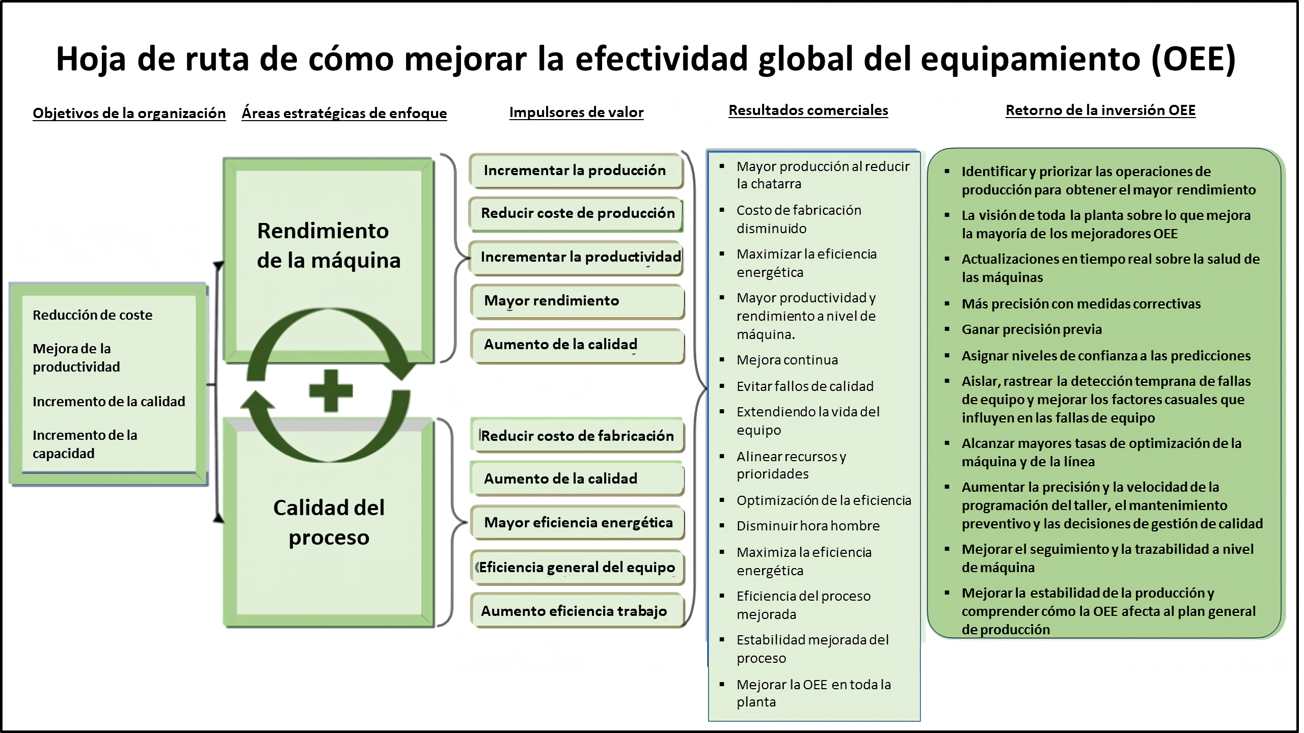La medición de OEE es una práctica recomendada en la fabricación. Al medir la OEE y las pérdidas subyacentes, se obtienen importantes conocimientos sobre cómo mejorar sistemáticamente el proceso de fabricación. La OEE es la mejor métrica para identificar pérdidas, evaluar el progreso y mejorar la productividad de los equipos de fabricación (es decir, eliminar el desperdicio).