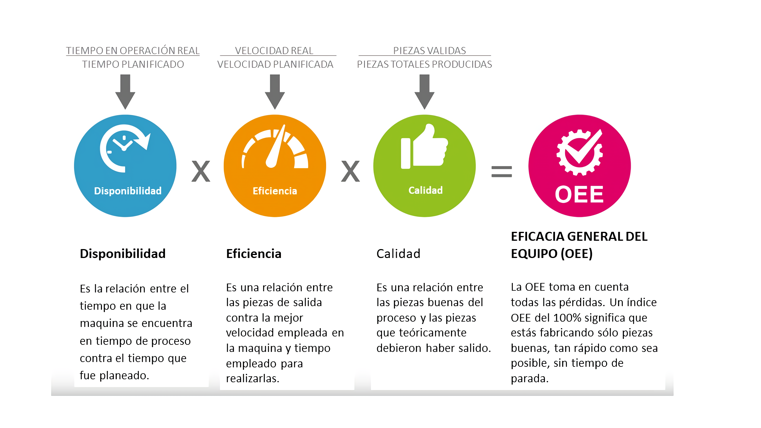 OEE (Eficacia general del equipo) es el estándar para medir la productividad de fabricación. En pocas palabras: identifica el porcentaje de tiempo de fabricación que es realmente productivo. Una puntuación OEE del 100% significa que está fabricando solo piezas buenas, lo más rápido posible, sin tiempo de parada. En el lenguaje de OEE, eso significa 100% de calidad (solo piezas buenas), 100% de rendimiento (lo más rápido posible) y 100% de disponibilidad (sin tiempo de parada).