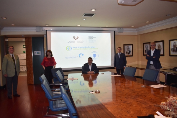 A la firma asistieron Raquel Idoeta, directora del Departamento de Ingeniería Nuclear y Mecánica de Fluidos de la Escuela; Rafael Díez Vega, en representación de WOSHIE España; Víctor de la Peña, profesor titular del Departamento de Máquinas y Motores Térmicos de la Escuela, en representación, como vocal, del Colegio de Ingenieros Industriales de Bizkaia (COIIB), y Alfonso Hernández Frías, gerente de la Fundación Euskoiker.