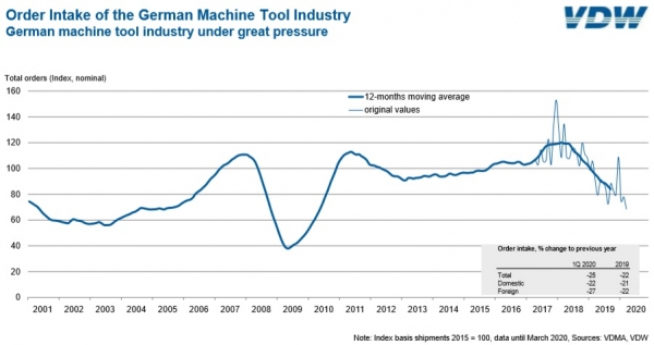 Los pedidos recibidos por la industria alemana de máquina-herramienta en el primer trimestre de 2020 se redujeron en un 25% respecto al mismo periodo del año pasado. Los pedidos procedentes de Alemania cayeron un 22% y se recibieron un 27% menos de pedidos procedentes del extranjero.