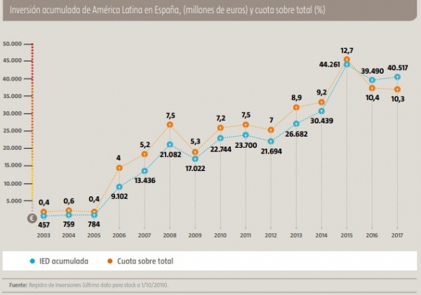 La IED latinoamericana en España alcanza los 40.517 millones de euros, lo que supone un incremento del 200% en los diez últimos años. Como consecuencia de este interés, la región, de manera conjunta, es el cuarto mayor inversor en España, solamente por detrás de EEUU, Reino Unido y Francia.