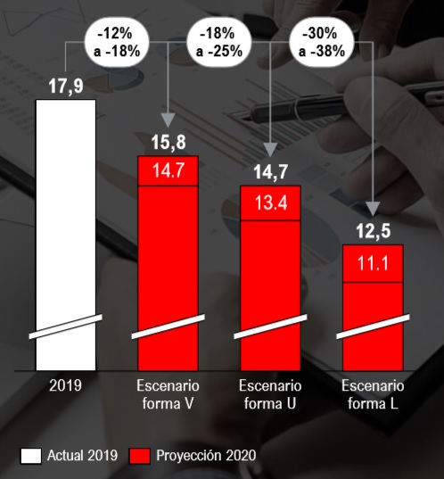- Forma de L – Profunda recesión: Las perturbaciones en las cadenas de suministro y en la producción, combinadas con las turbulencias y dificultades de los mercados financieros, dan lugar a unas ventas sumamente débiles en 2020. No habría recuperación significativa en 2020 debido al impacto continuo de la COVID-19 en las cadenas de suministro y la demanda mundiales. Si bien el comercio mundial puede estabilizarse antes, el impacto macroeconómico de la recesión/depresión podría sentirse en la oferta y la demanda durante un periodo prolongado.