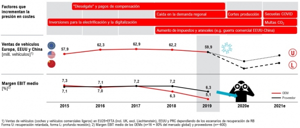 - Forma de U - Recuperación retardada: Significativa disminución de las ventas en el primer y segundo trimestre de 2020 hasta el comienzo del tercer trimestre de 2020 debido a la caída de la demanda, la escasez de componentes y las implicaciones en la cadena de suministro. La recuperación completa ocurriría a mediados de 2021, permitiendo datos positivos en el tercer y cuarto trimestre de 2021. El comercio mundial se estabilizaría en el cuarto trimestre de 2020, incluyendo las cadenas de suministro de la industria del automóvil.
