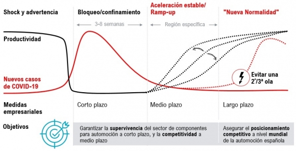 El desarrollo de la COVID-19 presenta tres horizontes temporales: bloqueo/confinamiento (corto plazo); aceleración estable / ramp-up (medio plazo), y “nueva normalidad” (largo plazo). El objetivo es garantizar la supervivencia del sector de componentes para automoción a corto plazo, y la competitividad a medio plazo. A largo plazo, el objetivo es asegurar el posicionamiento competitivo a nivel mundial de la automoción española.