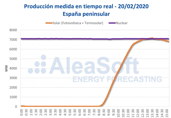 Un nuevo récord en la producción renovable se suma a los registrados en Europa en los días anteriores. En España se impuso el 20 de febrero, a las 13:30 h, un récord de producción fotovoltaica instantánea de 5.650 MW, según datos provisionales medidos en tiempo real de Red Eléctrica de España (REE). A esto se suma que, por primera vez en la historia, la producción solar en España, que incluye la fotovoltaica y la termosolar, supera a la producción nuclear. A las 13:30 h, se generaron 7.176 MW con energía solar, sobrepasando en 84 MW a los 7.092 MW producidos por la nuclear.